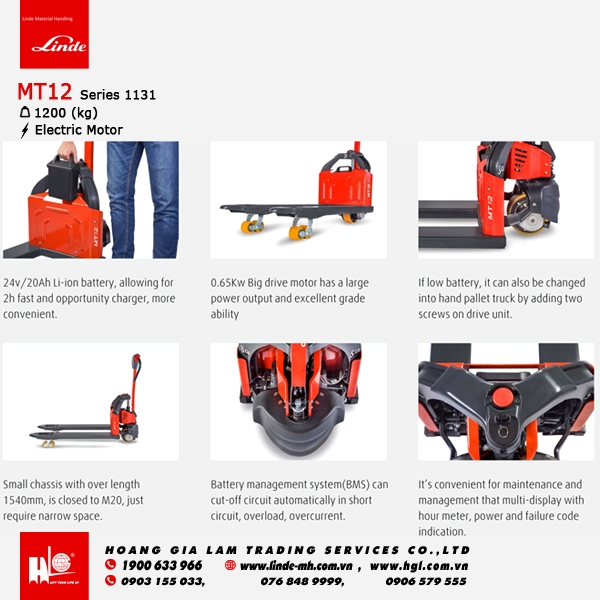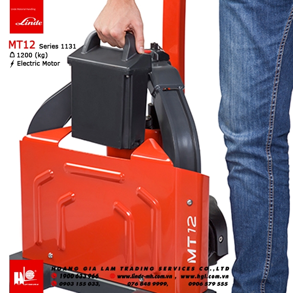 Linde MT12 đã được thiết kế đặc biệt cho các ứng dụng ánh sáng. Pin Li-ION công suất 24V / 20Ah không cần bảo trì cho phép sạc ở bất cứ đâu và và thay đổi bình điện nhanh chóng, giúp công việc được diễn ra liền mạch. Bình điện 26Ah phù hợp với nhiều nhu cầu nâng hạ.